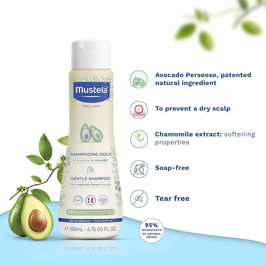 شامپو ملایم Mustela Gentle Shampoo با فرمولاسیون فوق‌العاده لطیف و مناسب پوست و موی حساس نوزادان و کودکان طراحی شده است. این شامپو با پایه گیاهی و فاقد مواد مضر، به‌طور تخصصی برای شستشوی روزانه موهای نازک و حساس کودک تولید شده و بدون ایجاد سوزش چشم یا خشکی پوست، مو را تمیز، نرم و خوش‌حالت می‌کند.