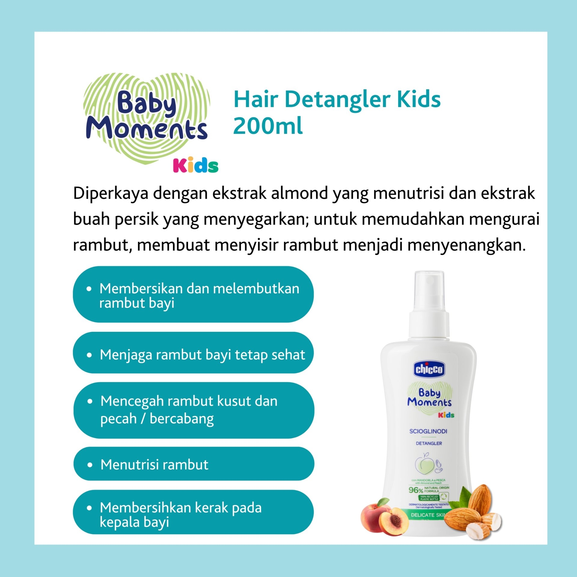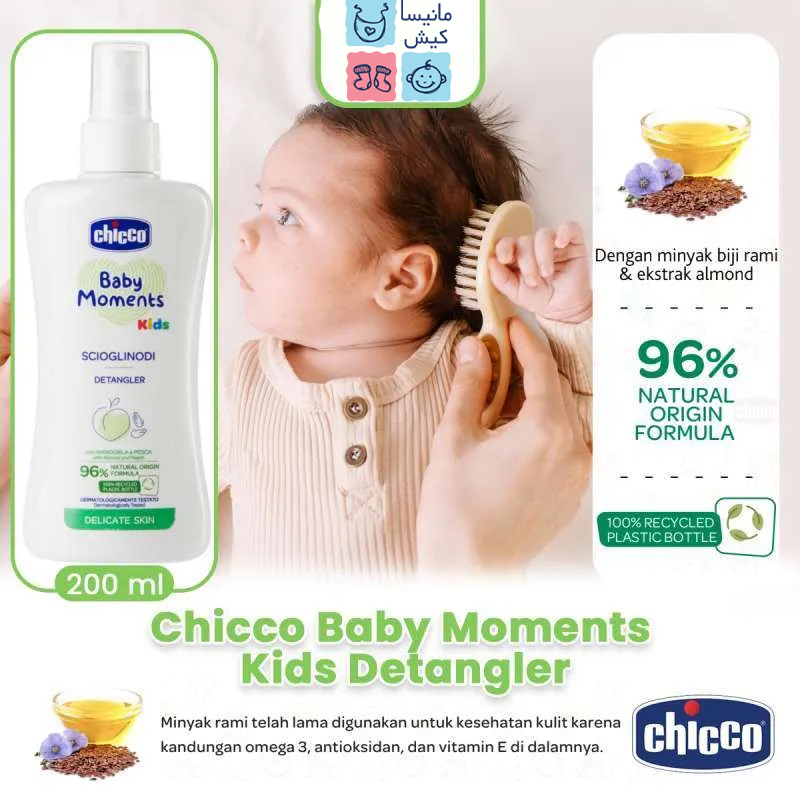 اسپری بازکننده گره موی کودک چیکو (Chicco Baby Moments Kids Detangler) راه‌حلی ملایم و مؤثر برای باز کردن گره‌های موی کودک است، بدون آنکه به مو یا پوست سر آسیبی وارد کند. این اسپری با ترکیبات طبیعی مانند عصاره بادام شیرین و هلو تولید شده و دارای ۹۶٪ مواد با منشأ طبیعی است. فرمول سبک و غیرچرب آن، موهای کودک را نرم، براق و خوش‌بو می‌کند و از کشیدگی و شکنندگی مو هنگام شانه‌کردن جلوگیری می‌کند.