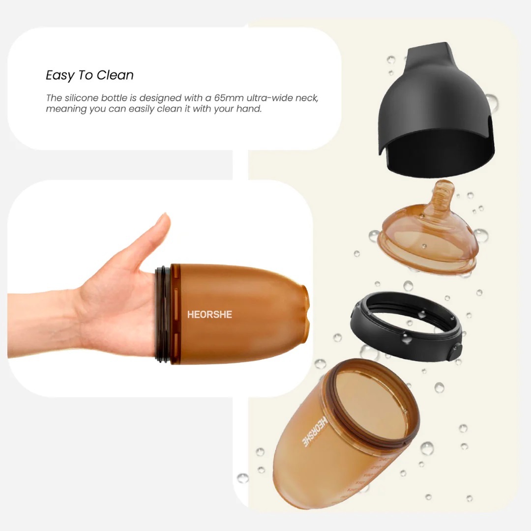 شیشه شیر هی‌اور‌شی در دو ظرفیت 160 و 240 میل طراحی شده تا پاسخگوی نیاز نوزادان در سنین مختلف باشد. این شیشه شیر با استفاده از موم طبیعی زنبورعسل ساخته شده که باعث حفظ بهتر کیفیت شیر و افزایش ماندگاری آن می‌شود. طراحی دقیق و ارگونومیک بدنه، به همراه سرشیشه‌های قابل‌انتخاب با جریان‌های مختلف، تجربه‌ای راحت و طبیعی را برای نوزاد فراهم می‌کند. همچنین سیستم ضدنفخ و ضدکولیک این محصول کمک می‌کند تا هنگام تغذیه، هوا وارد معده نوزاد نشود و از دل‌درد و ناراحتی‌های گوارشی جلوگیری شود. این شیشه شیر انتخابی امن، سالم و کاملاً سازگار با نیازهای نوزادان حساس است.